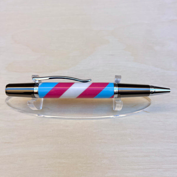 Pen Body: Blue, pink, and white Transgender Pride acrylic stripes polished to a glass-like finish.